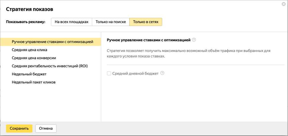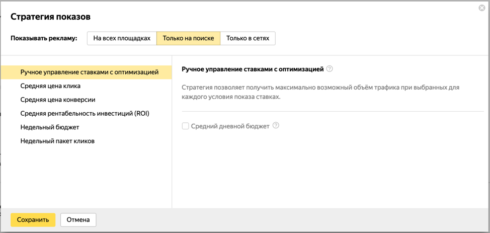 Для прицельной оптимизации других показателей в любой момент можно выбрать для поиска другие стратегии — например, автоматическую оптимизацию CPA, ROI или недельного бюджета.